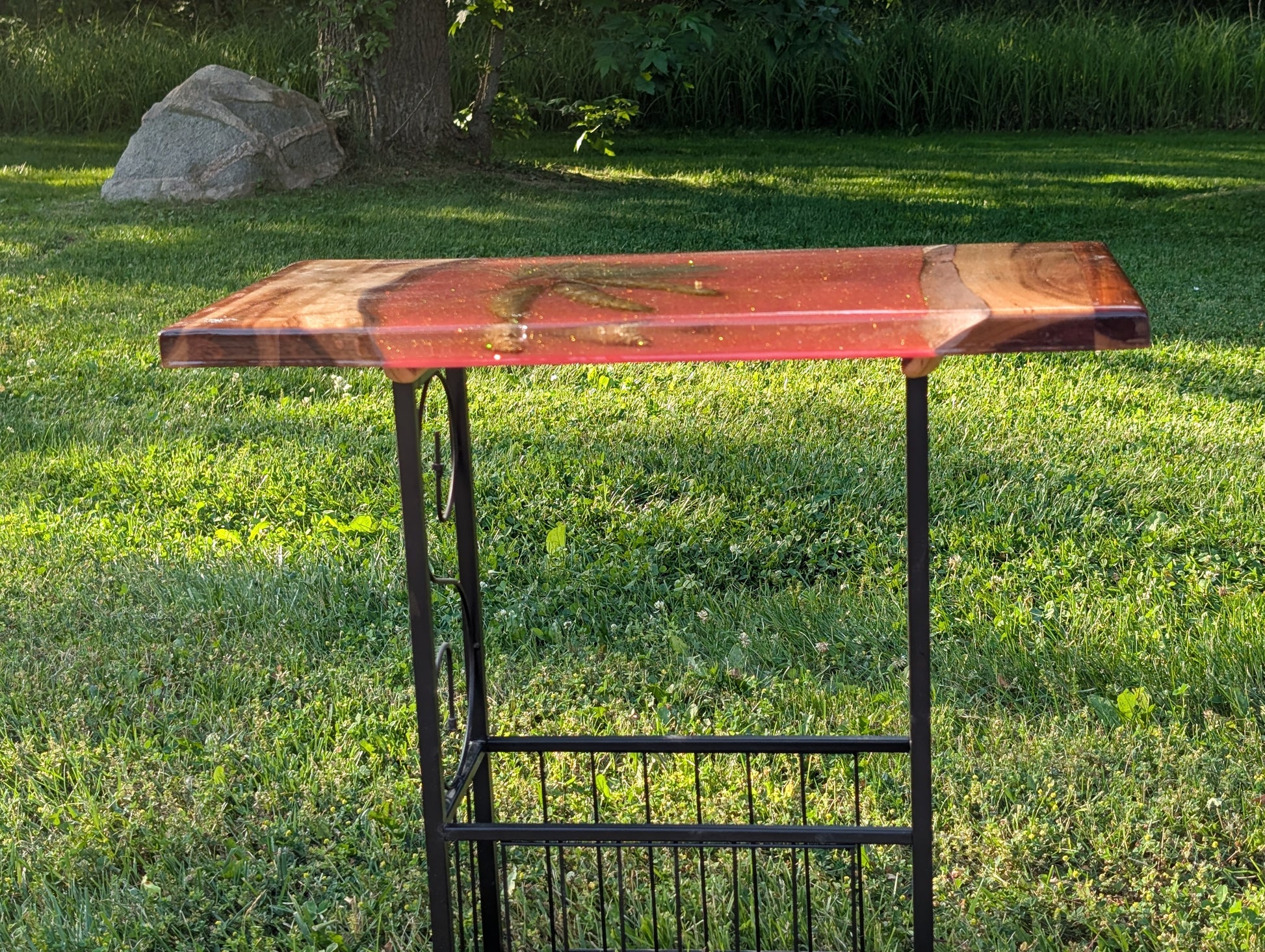 Indulge in the luxurious beauty of our Holiday Spirit End Table. Made with premium epoxy resin and black walnut, adorned with natural pine cones and real pine branches, this table exudes the elegance of the season. It measures 12x23in and 23 in tall. Perfect for uplifting any space and making a statement. Share the joy with friends and loved ones, or treat yourself to this amazing gift.