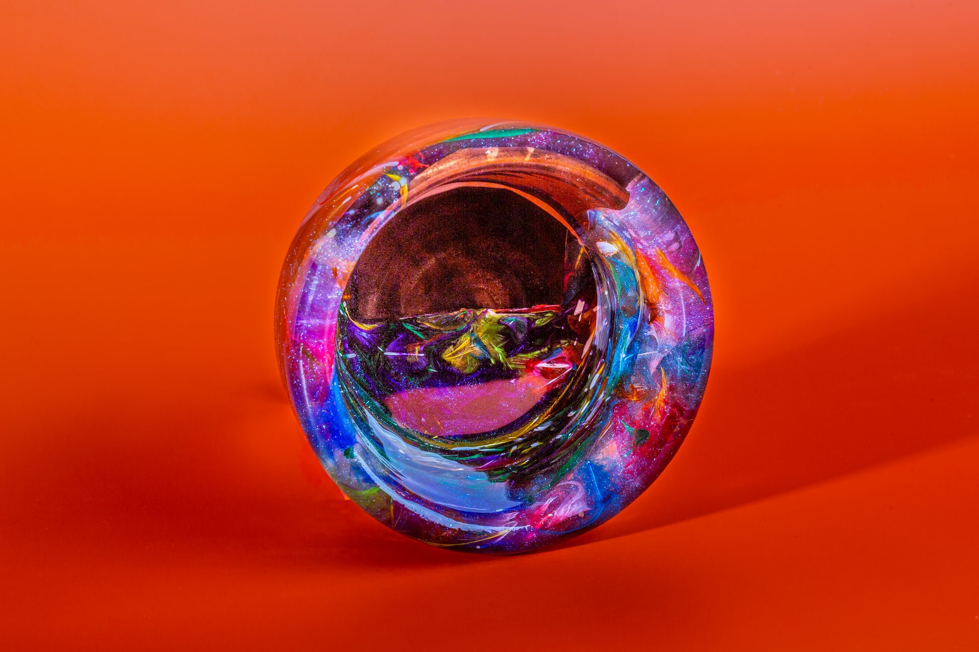 Discover a one-of-a-kind small bowl crafted from feathers, wood, and epoxy resin. Its stunning colors and flowy design create a captivating piece that measures 5.5" in diameter and 2.5" in height. Perfect for adding a unique touch to your décor or holding small treasures with style. Safe for cold food.